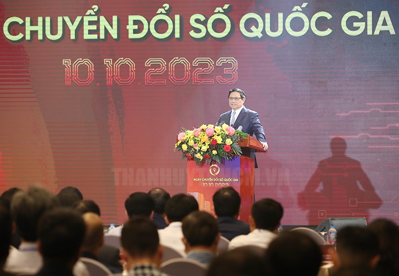 Phát biểu tại sự kiện, Thủ tướng Phạm Minh Chính nêu rõ, đây là năm thứ 2 liên tiếp, chúng ta tổ chức sự kiện quan trọng này, thể hiện quyết tâm của Đảng, Nhà nước, hệ thống chính trị, cộng đồng doanh nghiệp và nhân dân cả nước chung tay đẩy mạnh chuyển đổi số quốc gia. Thủ tướng cho rằng, chuyển đổi số là yêu cầu khách quan, là lựa chọn chiến lược, đã trở thành phong trào, là xu thế đang diễn ra rất mạnh mẽ, sâu rộng trên thế giới. Nhiều văn kiện và nghị quyết của Đảng đã đề cập sâu sắc về chuyển đổi số, kinh tế số, xã hội số trong các mục tiêu, quan điểm phát triển và đột phá chiến lược; xác định chuyển đổi số là một trong những nhiệm vụ trọng tâm. Năm 2023 là năm Dữ liệu số quốc gia, với quan điểm dữ liệu số là tài nguyên quốc gia, là nền tảng của sự phát triển, chúng ta cần nắm bắt, tận dụng cơ hội để khai thác, phát huy giá trị của dữ liệu số trở thành nguồn lực quan trọng cho phục vụ phát triển kinh tế số, xã hội số, công dân số. Chuyển đổi số quốc gia tầm nhìn đến năm 2030, Việt Nam sẽ trở thành quốc gia số, phát triển thịnh vượng, tiên phong ứng dụng các công nghệ mới và mô hình mới; đổi mới căn bản, toàn diện phương thức quản lý, điều hành của Chính phủ; sản xuất kinh doanh của doanh nghiệp; lối sống, làm việc và học tập của người dân; phát triển môi trường số an toàn, nhân văn, bao trùm, rộng khắp, không để ai bị bỏ lại phía sau.