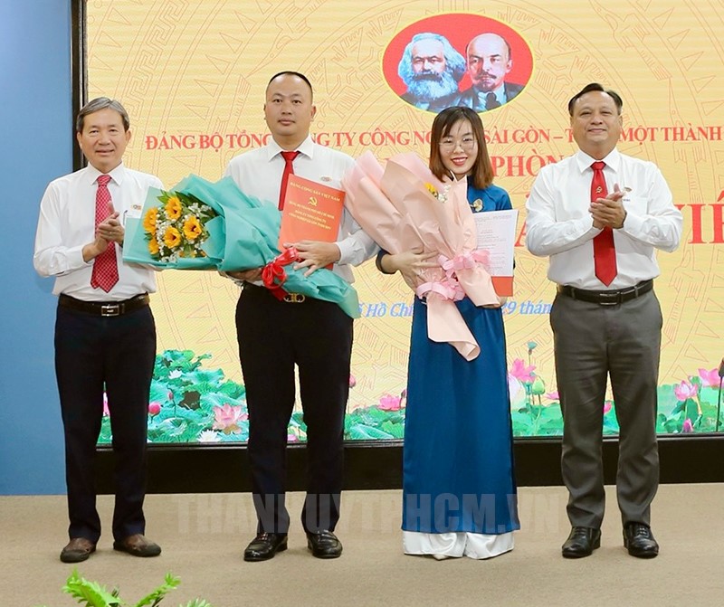 Đồng chí Trần Phi Long, Bí thư Đảng ủy, Chủ tịch Hội đồng thành viên Tổng Công ty và đồng chí Nguyễn Phương Đông – Phó Bí thư Đảng ủy, Tổng Giám đốc Tổng Công ty tặng hoa chúc mừng 2 đồng chí đảng viên mới.(Thanhuytphcm.vn) - Chiều 29/01, Chi bộ Cơ sở Văn Phòng Tổng Công ty thuộc Đảng bộ Tổng Công ty Công nghiệp Sài Gòn - TNHH Một thành viên tổ chức Lễ kết nạp đảng viên 2 quần chúng ưu tú. Đến dự có đồng chí Trần Phi Long - Bí thư Đảng ủy, Chủ tịch Hội đồng thành viên Tổng Công ty.