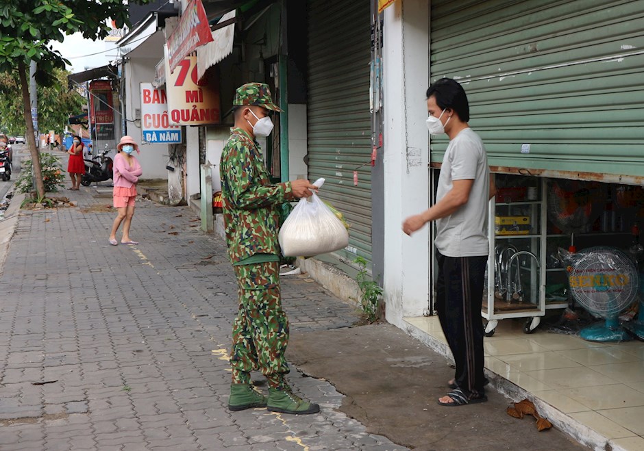 Cán bộ chiến sĩ Sư đoàn 5 đi trao quà hỗ trợ cho người dân trên đường Trần Não. (Ảnh: Duy Quỳnh)(Thanhuytphcm.vn) - Ngay khi TPHCM thực hiện giãn cách theo Chỉ thị 16/CT-TTg của Thủ tướng Chính phủ, bên cạnh việc bảo vệ tính mạng, sức khỏe của người dân, ngăn chặn số ca nhiễm mới, thì công tác an sinh xã hội (ASXH) cho người dân được xác định là một trong những nhiệm vụ trọng tâm. Nhiều hoạt động chăm lo ASXH được 21 quận, huyện và TP Thủ Đức triển khai mạnh mẽ.