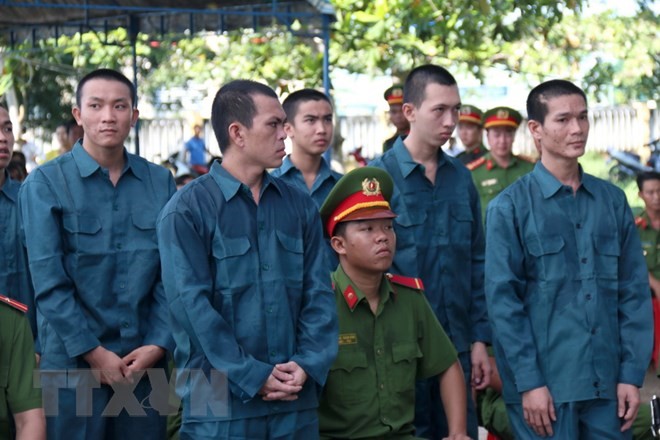 Các bị cáo tại phiên tòa. (Ảnh: TTXVN)Ngày 26/9, tại thị trấn Chợ Lầu, huyện Bắc Bình, tỉnh Bình Thuận, Tòa án Nhân dân huyện Bắc Bình đã mở phiên tòa sơ thẩm xét xử 15 bị cáo trong vụ án “gây rối trật tự công cộng” xảy ra ngày 11/6 tại xã Phan Rí Thành, huyện Bắc Bình.