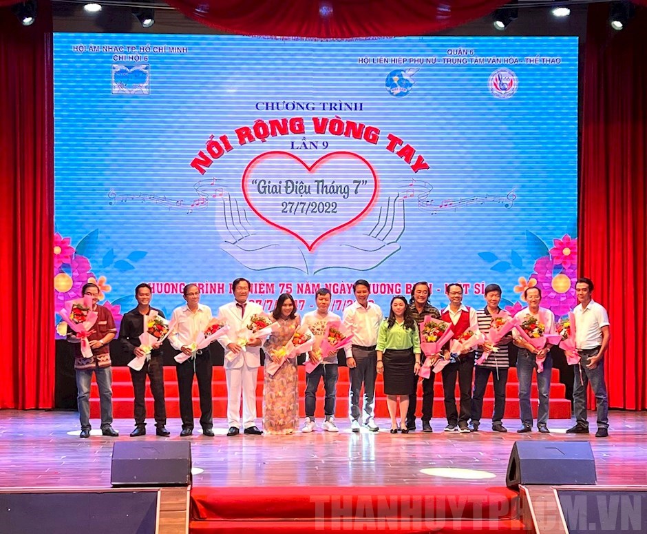 Ban Tổ chức trao tặng hoa cho các nghệ sĩ(Thanhuytphcm.vn) - Nhân kỷ niệm 75 năm Ngày Thương binh – Liệt sỹ (27/7/1947 – 27/7/2022), chiều 26/7, Trung tâm Văn hóa – Thể thao Quận 6, Hội LHPN Quận 6 phối hợp với Chi hội 6 (Hội Âm nhạc TPHCM) tổ chức chương trình ca nhạc “Nối rộng vòng tay” lần 9, chủ đề “Giai điệu tháng 7” tại Trung tâm Văn hóa Hậu Giang (số 259 đường Hậu Giang, Phường 5, Quận 6).