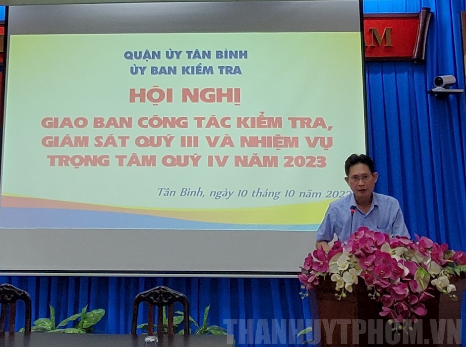 Phát biểu kết luận hội nghị, Phó Bí thư Thường trực Quận ủy quận Tân Bình Nguyễn Hoàng Long đánh giá cao những nỗ lực của cấp ủy cơ sở, ủy ban kiểm tra các cấp trong thực hiện nhiệm vụ kiểm tra, giám sát trong 9 tháng năm 2023. Thời gian tới, đồng chí đề nghị các đảng ủy, chi ủy cơ sở rà soát, hoàn thành các nội dung kiểm tra, giám sát theo chương trình năm 2023 đã đề ra; tiếp tục theo dõi, đôn đốc các tổ chức đảng trực thuộc thực hiện và hoàn thành kế hoạch kiểm tra, giám sát năm 2023.
