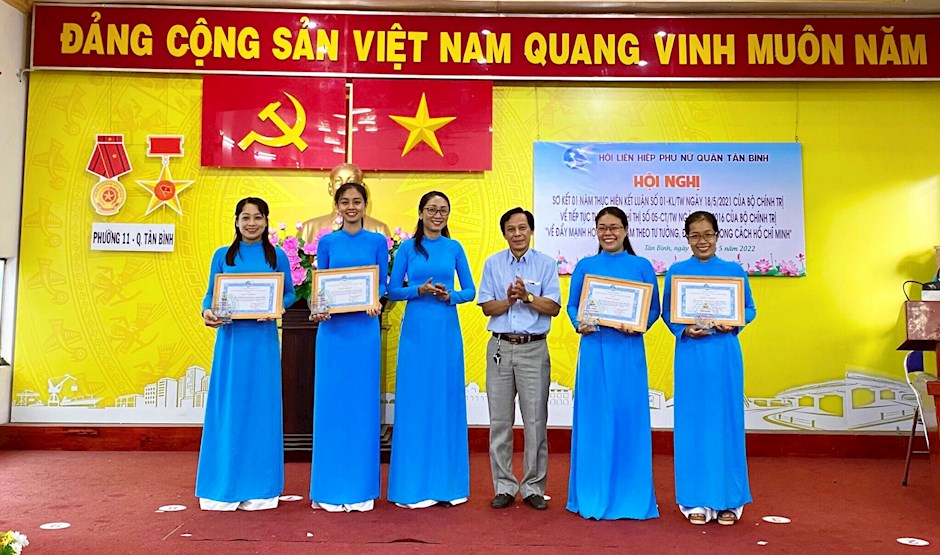 Các đồng chí lãnh đạo quận trao giấy khen và biểu trưng cho 4 tập thể điển hình thực hiện tốt học tập và làm theo tư tưởng, đạo đức, phong cách Hồ Chí Minh, giai đoạn 2021 - 2022(Thanhuytphcm.vn) - Sáng 18/5, Hội LHPN quận Tân Bình tổ chức sơ kết 1 năm thực hiện Kết luận số 01-KL/TW Kết luận số 01-KL/TW ngày 18/5/2021 của Bộ Chính trị về tiếp tục thực hiện Chỉ thị số 05-CT/TW ngày 15/5/2016 của Bộ Chính trị khóa XII "Về đẩy mạnh học tập và làm theo tư tưởng, đạo đức, phong cách Hồ Chí Minh" (19/5/2021 – 19/5/2022).