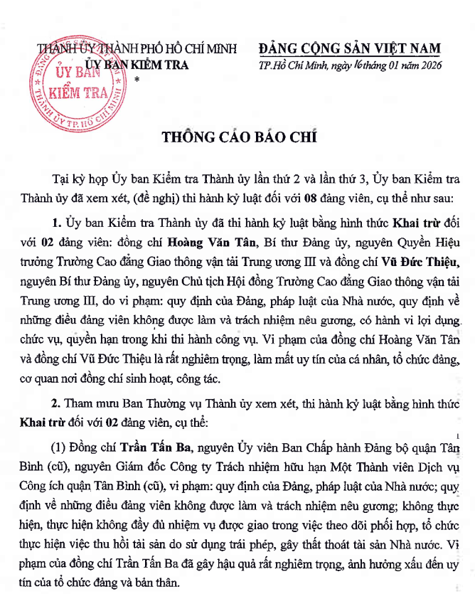 Cập nhật 15:38 16-01-2026Ủy ban Kiểm tra Thành ủy xem xét thi hành kỷ luật 8 đảng viên(Thanhuytphcm.vn) - Chiều 16/1, Ủy ban Kiểm tra Thành ủy TPHCM cho biết, tại kỳ họp Ủy ban Kiểm tra Thành ủy lần thứ 2 và lần thứ 3, Ủy ban Kiểm tra Thành ủy đã xem xét thi hành kỷ luật đối với 8 đảng viên, cụ thể: Ủy ban Kiểm tra Thành ủy đã thi hành kỷ luật bằng hình thức Khai trừ đối với 2 đảng viên: đồng chí Hoàng Văn Tân, Bí thư Đảng ủy, nguyên Quyền Hiệu trưởng Trường Cao đẳng Giao thông vận tải Trung ương III và đồng chí Vũ Đức Thiệu, nguyên Bí thư Đảng ủy, nguyên Chủ tịch Hội đồng Trường Cao đẳng Giao thông vận tải Trung ương III, do vi phạm: quy định của Đảng, pháp luật của Nhà nước, quy định về những điều đảng viên không được làm và trách nhiệm nêu gương, có hành vi lợi dụng chức vụ, quyền hạn trong khi thi hành công vụ. Vi phạm của đồng chí Hoàng Văn Tân và đồng chí Vũ Đức Thiệu là rất nghiêm trọng, làm mất uy tín của cá nhân, tổ chức đảng, cơ quan nơi đồng chí sinh hoạt, công tác.