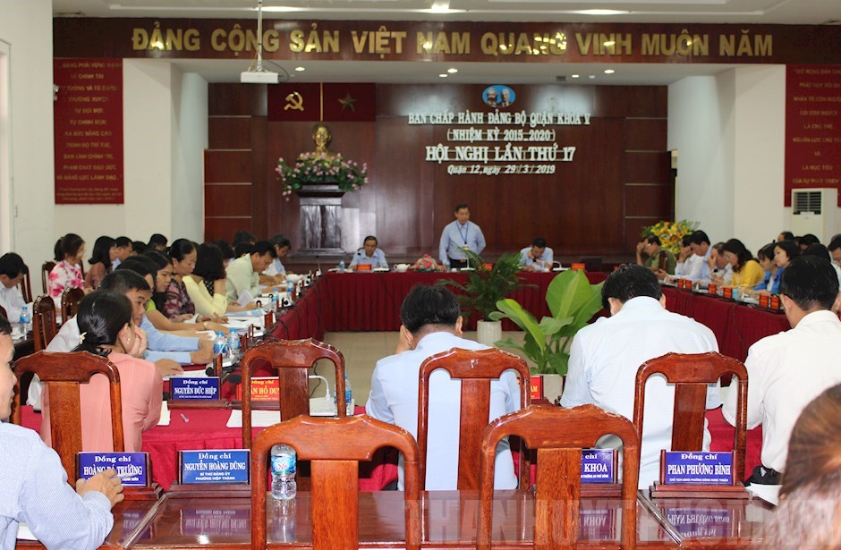 (Thanhuytphcm.vn) - Ngày 29/3, Quận ủy Quận 12 tổ chức Hội nghị Ban Chấp hành Đảng bộ Quận 12 lần thứ 17 khóa V, nhiệm kỳ 2015 - 2020, nhằm kiểm điểm đánh giá tình hình thực hiện nhiệm vụ phát triển kinh tế - xã hội, quốc phòng an ninh, công tác xây dựng Đảng, công tác dân vận quý I, phương hướng nhiệm vụ quý II năm 2019. Đồng chí Trần Hữu Trí, Bí thư Quận ủy, Chủ tịch HĐND Quận chủ trì hội nghị (ảnh).