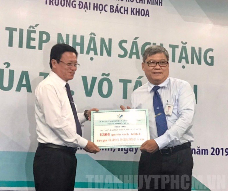 Cập nhật 21:05 26-04-2019Việt kiều Mỹ tặng hơn 1.300 quyển sách cho Trường Đại học Bách khoa TPHCM(Thanhuytphcm.vn) - Ngày 26/4, tại Trường Đại học Bách khoa TPHCM, thông qua Ủy ban về người Việt Nam ở nước ngoài TPHCM, TS Võ Tá Hân (kiều bào Mỹ) đã trao tặng 1.301 quyển sách cho thư viện trường. Đây là những quyển sách quý chuyên ngành khoa học kỹ thuật của World Scientific, trị giá 150.000 USD, tương đương 3,4 tỷ đồng.