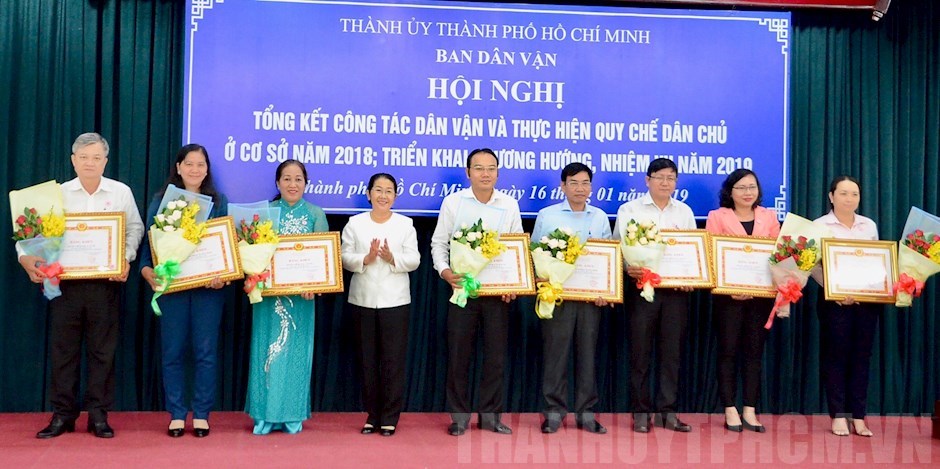 (Thanhuytphcm.vn) – Sáng 16/1, Ban Dân vận Thành ủy TPHCM tổ chức hội nghị tổng kết công tác dân vận năm 2018; triển khai nhiệm vụ năm 2019. Đến dự có Phó Bí thư Thành ủy TPHCM Võ Thị Dung; Uỷ viên Ban Thường vụ Thành ủy, Phó Chủ tịch Thường trực UBND TP Lê Thanh Liêm; Uỷ viên Ban Thường vụ Thành ủy, Trưởng ban Dân vận Thành ủy TP Nguyễn Hữu Hiệp; Phó Chủ tịch HĐND TP Trương Thị Ánh.