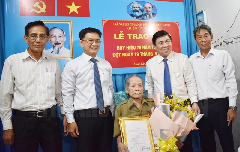 (Thanhuytphcm.vn) - Chiều 19/5, Ủy viên Trung ương Đảng, Phó Bí thư Thành ủy, Chủ tịch UBND TPHCM Nguyễn Thành Phong đã đến nhà riêng trao tặng Huy hiệu 70 năm tuổi Đảng cho đồng chí Lê Hoàng Thâm, ngụ phường Linh Tây, quận Thủ Đức, đợt 19/5.