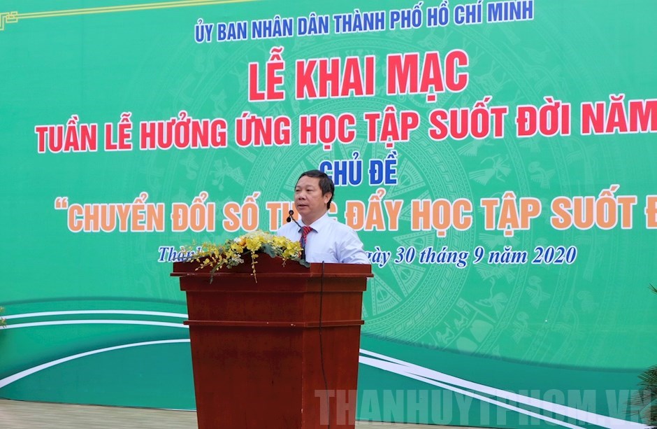 Phó Chủ tịch UBND TP Dương Anh Đức phát biểu tại lễ khai mạc(Thanhuytphcm.vn) - Sáng 30/9, tại Trường THCS Lương Định Của (Quận 2) đã diễn ra Lễ khai mạc Tuần lễ hưởng ứng học tập suốt đời năm 2020 với chủ đề "Chuyển đổi số thúc đẩy học tập suốt đời". Đến dự có các đồng chí: Dương Anh Đức, Phó Chủ tịch UBND TP; Lê Hồng Sơn, Giám đốc Sở GD-ĐT TP; đại diện Bộ GD-ĐT.