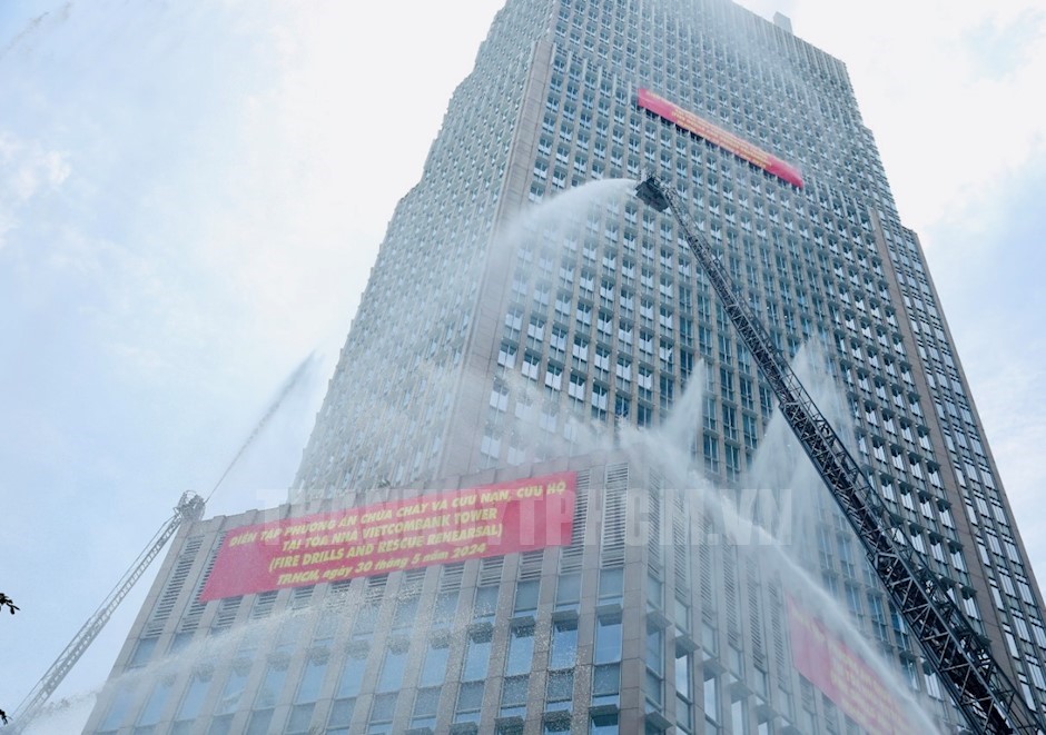 Diễn tập chữa cháy tại Vietcombank Tower(Thanhuytphcm.vn) - Trưa 30/5, Phòng Cảnh sát phòng cháy chữa cháy và cứu nạn cứu hộ (PCCC-CNCH) (PC07) Công an TPHCM phối hợp tổ chức diễn tập phương án chữa cháy và cứu nạn, cứu hộ tại tòa nhà Vietcombank Tower, số 5 Công trường Mê Linh, phường Bến Nghé, Quận 1.
