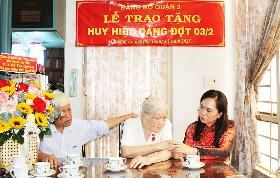 Đồng chí Vũ Tuệ Quỳnh nhận quyết định tặng Huy hiệu 65 năm tuổi Đảng(Thanhuytphcm.vn) - Sáng 23/1, Thành ủy viên, Bí thư Quận ủy Quận 3 Nguyễn Thanh Xuân dẫn đầu đoàn đại biểu Quận ủy, UBND, Ủy ban MTTQ Việt Nam Quận 3 đến thăm và trao Huy hiệu Đảng tại nhà các đảng viên cao tuổi Đảng đợt 3/2/2025.