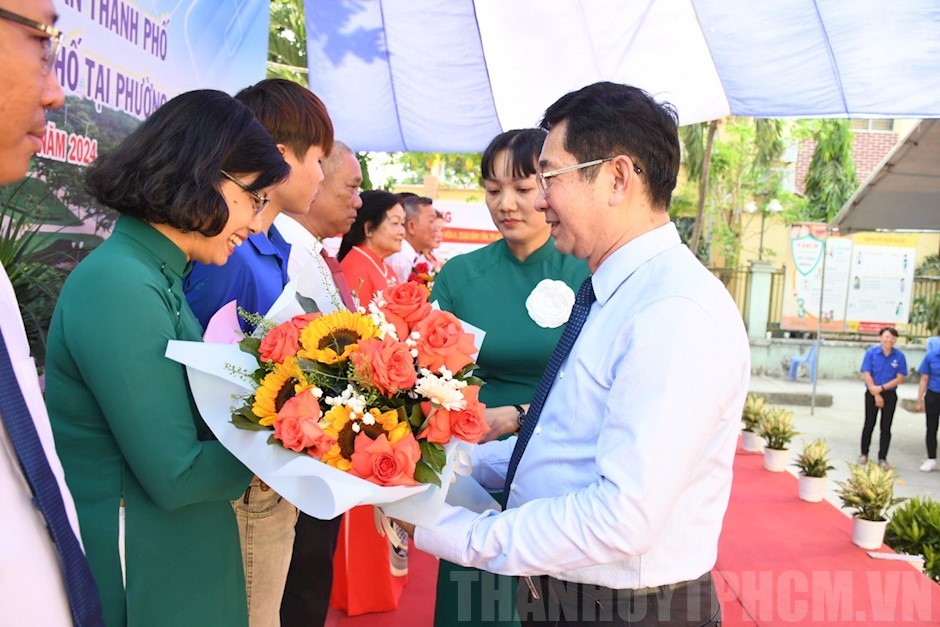 Ủy viên Ban Thường vụ Thành ủy, Chủ nhiệm Ủy ban Kiểm tra Thành ủy Dương Ngọc Hải tặng hoa chúc mừng nhân sự khu phố mới tại phường Bình Hưng Hòa A(Thanhuytphcm.vn) - Sáng 12/4, Đảng ủy - UBND - Ủy ban MTTQ Việt Nam phường Bình Hưng Hòa A tổ chức lễ công bố Nghị quyết số 11/NQ-HĐND ngày 14/3/2024 của HĐND Thành phố về thành lập, chia tách, sáp nhập, đổi tên khu phố, ấp trên địa bàn Thành phố và ra mắt khu phố mới.