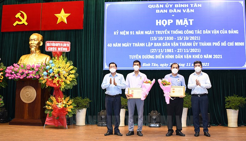 Dịp này Ban Dân vận Trung ương tặng kỷ niệm chương “Vì sự nghiệp Dân vận” cho 2 cá nhân có nhiều đóng góp cho sự nghiệp công tác Dân vận của Đảng; tặng bằng khen của Chủ tịch UBND TPHCM cho 2 tập thể, 3 cá nhân; tặng bằng khen của UBND quận Bình Tân cho 51 tập thể, 93 cá nhân có thành tích xuất sắc trong phong trào thi đua Dân vận khéo năm 2021.