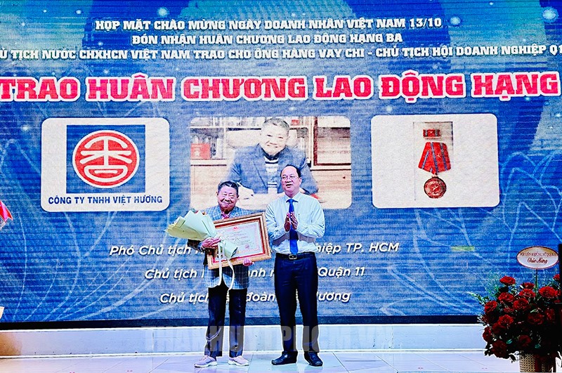 Phó Bí thư Thành ủy TP Nguyễn Hồ Hải trao Huân Chương Lao động hạng Ba của Chủ tịch nước cho Chủ tịch Hội doanh nghiệp Quận 11 Hàng Vay Chi.(Thanhuytphcm.vn) - Sáng 6/10, Ban Chấp hành Hội doanh nghiệp Quận 11 tổ chức chương trình họp mặt chào mừng Ngày doanh nhân Việt Nam 13/10/2023; lễ đón nhận Huân chương Lao động hạng Ba do Chủ tịch nước tặng Chủ tịch Hội doanh nghiệp Quận 11 Hàng Vay Chi. Đến dự có Phó Bí thư Thành ủy TPHCM Nguyễn Hồ Hải.