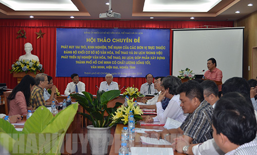 (Thanhuytphcm.vn) - Ngày 9/10, Đảng ủy Khối cơ sở Bộ Văn hóa, Thể thao và Du lịch tại TPHCM tổ chức Hội thảo chuyên đề “Phát huy vai trò, kinh nghiệm, thế mạnh của các đơn vị trực thuộc Đảng bộ Khối cơ sở Bộ Văn hóa, Thể thao và Du lịch trong việc phát triển sự nghiệp văn hóa, thể thao, du lịch; góp phần xây dựng TPHCM có chất lượng sống tốt, văn minh, hiện đại, nghĩa tình”. Hội thảo nhằm đóng góp ý kiến xây dựng dự thảo báo cáo chính trị Đại hội đại biểu Đảng bộ TPHCM lần X (nhiệm kỳ 2015 – 2020).
