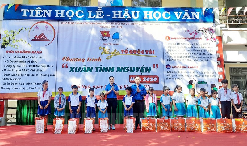 Trao quà cho các em học sinh người dân tộc có hoàn cảnh khó khăn.(Thanhuytphcm.vn) – Ngày 9/1, Cụm thi đua số 2 Thành đoàn TPHCM (gồm các quận 4, 6, 8, Bình Thạnh, Gò Vấp, Phú Nhuận, Tân Phú) do Quận đoàn Phú Nhuận làm cụm trưởng đã tổ chức Chương trình “Nghĩa tình biên giới” nhân dịp Xuân Canh Tý năm 2020 tại địa bàn huyện Tân Châu, tỉnh Tây Ninh.