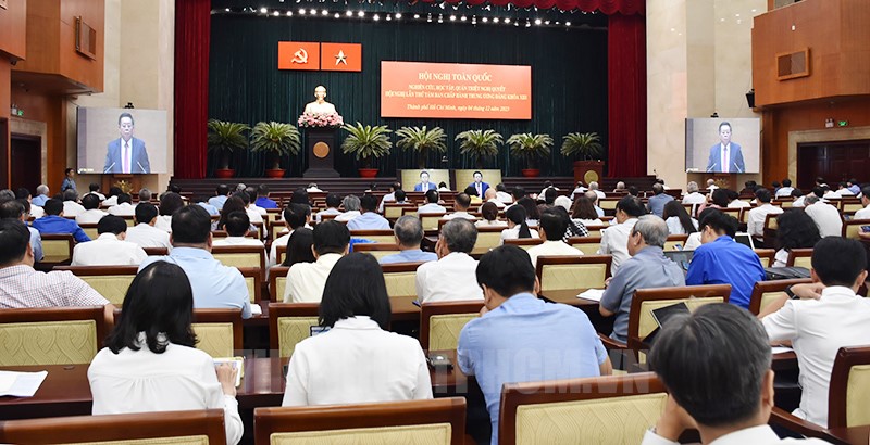 Đồng chí Nguyễn Trọng Nghĩa trình bày chuyên đề “Tiếp tục xây dựng và phát huy vai trò của đội ngũ trí thức đáp ứng yêu cầu phát triển đất nước nhanh và bền vững trong giai đoạn mới”. (Ảnh: Dangcongsan.vn)(Thanhuytphcm.vn) - Chiều 4/12, Hội nghị toàn quốc nghiên cứu, học tập, quán triệt Nghị quyết Hội nghị lần thứ 8 Ban Chấp hành Trung ương Đảng khóa XIII do Bộ Chính trị, Ban Bí thư tổ chức, đồng chí Nguyễn Trọng Nghĩa, Bí thư Trung ương Đảng, Trưởng Ban Tuyên giáo Trung ương đã truyền đạt chuyên đề Nghị quyết số 45-NQ/TW về “Tiếp tục xây dựng và phát huy vai trò của đội ngũ trí thức đáp ứng yêu cầu phát triển đất nước nhanh và bền vững trong giai đoạn mới”.