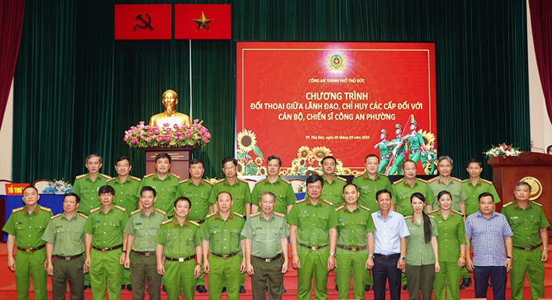 Các đại biểu dự đối thoại cùng chụp hình lưu niệm.(Thanhuytphcm.vn) - Sáng 5/3, Đại tá Trần Văn Hiếu, Ủy viên Ban Thường vụ Thành ủy, Bí thư Đảng ủy, Trưởng Công an TP Thủ Đức chủ trì chương trình đối thoại giữa lãnh đạo, chỉ huy các cấp đối với cán bộ, chiến sĩ công an phường thuộc địa bàn TP Thủ Đức. Đến dự có Thượng tá Nguyễn Đình Dương, Phó Giám đốc Công an TPHCM và lãnh đạo 34 phường.