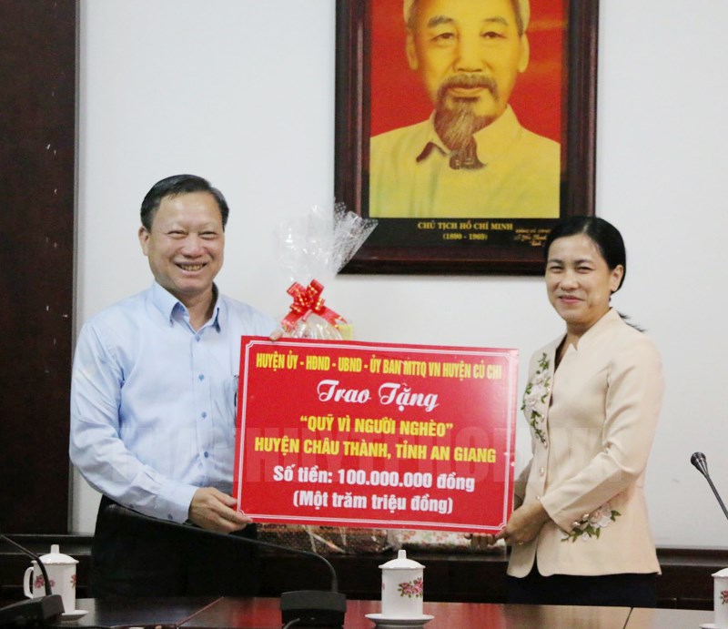 Dịp này, huyện Củ Chi đã trao tặng 100 triệu đồng cho “Quỹ vì người nghèo” huyện Châu Thành, tỉnh An Giang.