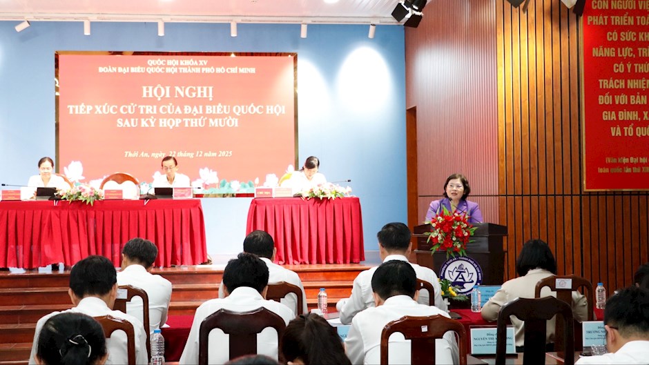 Quang cảnh buổi tiếp xúc cử triChiều 22/12, Tổ ĐBQH TPHCM đơn vị số 4, gồm các đại biểu (ĐB): Văn Thị Bạch Tuyết, Phó Bí thư Thành ủy TPHCM; PGS-TS Trần Hoàng Ngân; Nguyễn Thị Hồng Hạnh, Giám đốc Sở Tư pháp TPHCM, tiếp xúc cử tri các phường: Đông Hưng Thuận, Trung Mỹ Tây, Tân Thới Hiệp, Thới An, An Phú Đông, sau kỳ họp thứ 10, Quốc hội khóa XV.