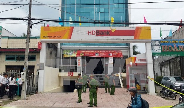 Công an Đồng Nai đang phong tỏa hiện trường vụ cướp để điều tra. (Ảnh: TTXVN)