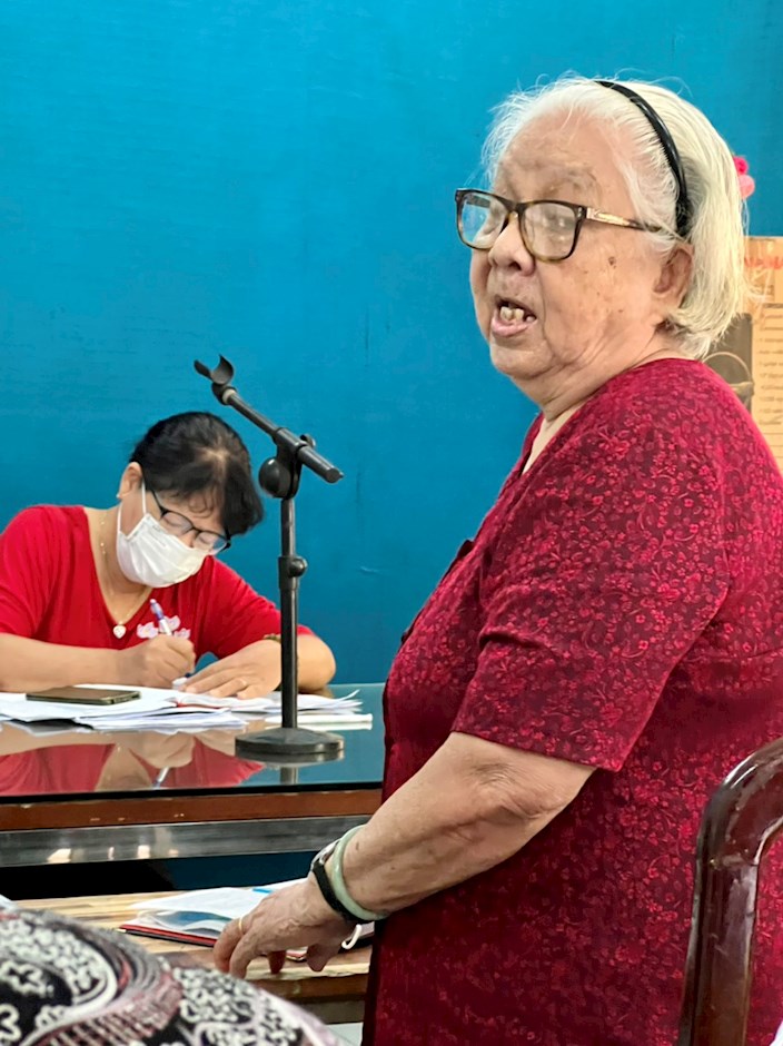 Đồng chí Phạm Kim Dung phát biểu trong cuộc họp chi bộ(Thanhuytphcm.vn) - Năm nay, đảng viên Phạm Kim Dung (thường trú tại Khu phố 1, phường 15, quận Bình Thạnh, TPHCM) đã bước sang tuổi 85. Đồng chí là một trong những đảng viên kỳ cựu của Chi bộ khu phố 1, thuộc Đảng bộ phường 15, quận Bình Thạnh, đến nay vừa tròn 58 năm tuổi Đảng.