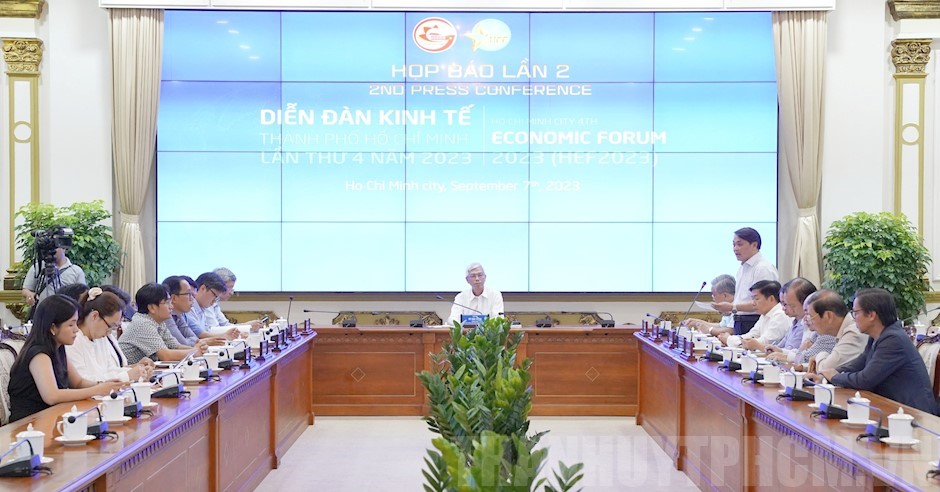 Quang cảnh họp báo(Thanhuytphcm.vn) – Trưa 7/9, Phó Chủ tịch UBND TPHCM Võ Văn Hoan chủ trì họp báo thông tin về Diễn đàn Kinh tế TPHCM lần thứ 4 năm 2023 (HEF 2023).
