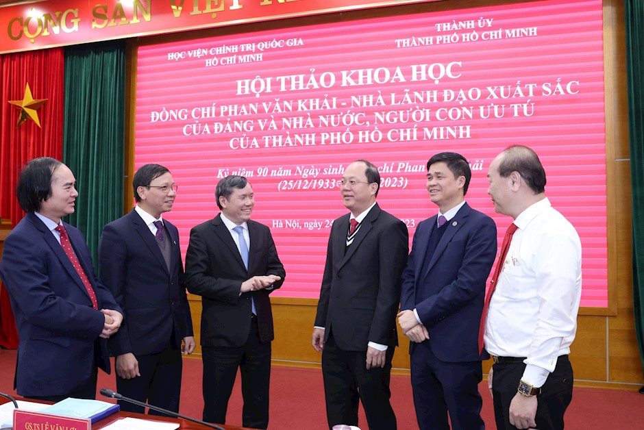 Đồng chí Nguyễn Hồ Hải, Phó Bí thư Thành ủy TPHCM (thứ 3 từ phải qua) cùng các đại biểu tại hội thảo. (Ảnh: Như Quỳnh)(Thanhuytphcm.vn) - Chiều 24/12, tại Hà Nội, Học viện Chính trị quốc gia Hồ Chí Minh và Thành ủy TPHCM phối hợp tổ chức hội thảo “Đồng chí Phan Văn Khải - Nhà lãnh đạo xuất sắc của Đảng và Nhà nước, người con ưu tú của TPHCM”. Đồng chủ trì hội thảo có đồng chí Nguyễn Hồ Hải, Phó Bí thư Thành ủy TPHCM.