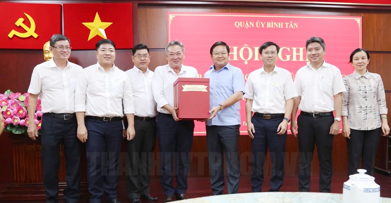 Lãnh đạo Tổng công ty Điện lực TPHCM tặng quà lưu niệm cho lãnh đạo quận Bình Tân. (Ảnh: Chi Lan)(Thanhuytphcm.vn) - Phát biểu tại buổi làm việc về công tác phối hợp giữa Tổng công ty Điện lực TPHCM (EVNHCMC) và Quận ủy, UBND quận Bình Tân vào chiều 12/4, đồng chí Phạm Quốc Bảo, Bí thư Đảng ủy, Chủ tịch Hội đồng thành viên EVNHCMC cho biết: EVNHCMC sẽ tích cực phối hợp với quận Bình Tân để triển khai thực hiện tốt công tác quy hoạch phát triển lưới điện; triển khai kế hoạch ngầm hóa lưới điện nhằm mục tiêu tiến tới xây dựng cơ sở hạ tầng kỹ thuật lưới điện và dây thông tin theo tiêu chuẩn đô thị hiện đại, thông minh; thực hiện tốt công tác truyền thông đến người dân các chủ trương, chính sách của ngành Điện như: tuyên truyền, vận động người dân sử dụng ứng dụng EVNHCMC CSKH; lắp đặt và sử dụng hệ thống điện mặt trời trên mái nhà tại các cơ quan hành chính sự nghiệp; các biện pháp sử dụng điện an toàn - tiết kiệm - hiệu quả...