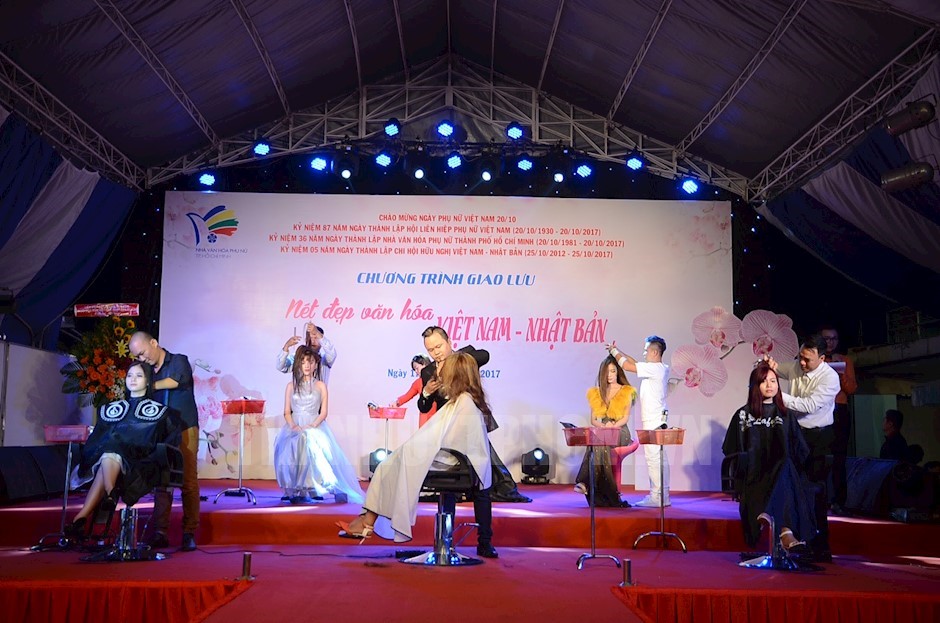 Màn trình diễn cắt chải tóc và bới tóc do các nhà tạo mẫu chuyên nghiệp thuộc CLB Tóc Nhà văn hoá Phụ nữ TP thể hiện(Thanhuytphcm.vn) – Nhân kỷ niệm 87 năm Ngày thành lập Hội Liên hiệp Phụ nữ Việt Nam (20/10/1930 – 20/10/2017); 36 năm Ngày thành lập Nhà Văn hóa Phụ nữ TPHCM (20/10/1981 – 20/10/2017), tối 17/10, Nhà Văn hóa Phụ nữ TPHCM phối hợp Chi hội Hữu nghị Việt Nam – Nhật Bản tổ chức chương trình giao lưu nét đẹp văn hoá Việt Nam – Nhật Bản. Đến dự có Chủ tịch Hội Liên hiệp Phụ nữ Việt Nam TPHCM Nguyễn Thị Ngọc Bích.