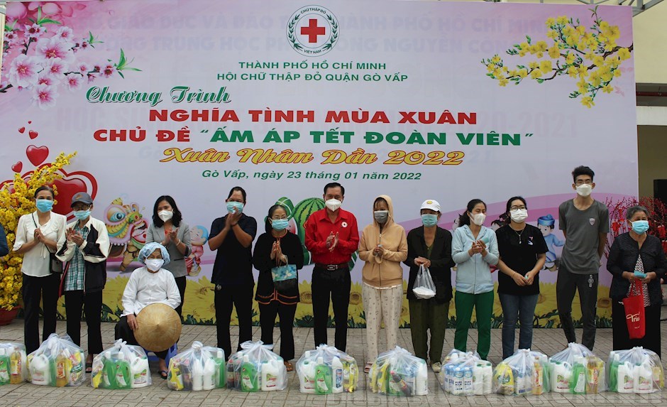 Đồng chí Trần Trường Sơn và đồng chí Nguyễn Thị Thu Hoài trao quà cho người có hoàn cảnh khó khăn(Thanhuytphcm.vn) - Sáng 23/1, Hội Chữ thập đỏ quận Gò Vấp đã tổ chức Chương trình “Nghĩa tình mùa xuân” chăm lo cho trẻ em mồ côi, người có hoàn cảnh khó khăn trên địa bàn nhân dịp Tết Nguyên đán Nhâm Dần 2022. Đến dự có các đồng chí: Trần Trường Sơn, Chủ tịch Hội Chữ thập đỏ TPHCM; Nguyễn Thị Thu Hoài, Phó Bí thư Thường trực Quận ủy; Trần Thị Thanh Nhàn, Ủy viên Thường vụ, Trưởng ban Dân vận Quận ủy…