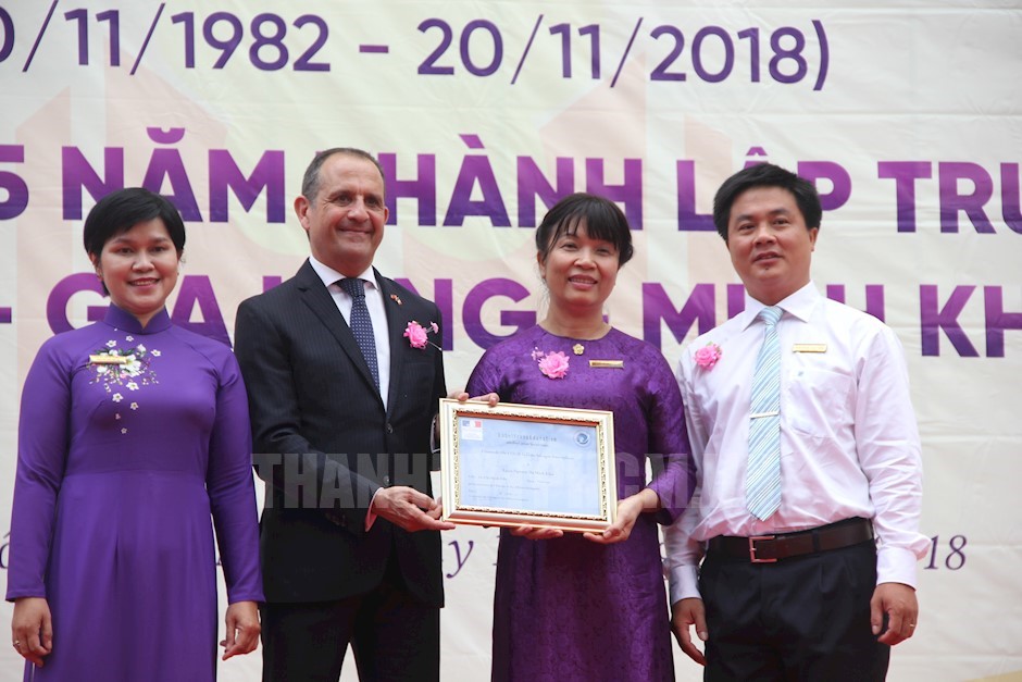 Đại diện Trường THPT Nguyễn Thị Minh Khai đón nhận Nhãn hiệu LabelFranceEducation. (ảnh: Thy Dương)(Thanhuytphcm.vn) - Tại Lễ kỷ niệm 36 năm Ngày Nhà giáo Việt Nam 20/11 và 105 năm thành lập Trường THPT Nguyễn Thị Minh Khai (1913-2018) diễn ra vào ngày 19/11, Tổng Lãnh sự Cộng hòa Pháp tại TPHCM Vincent Floreani đã trao Nhãn hiệu LabelFranceEducation cho trường.