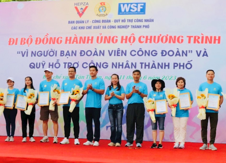 Đồng chí Hứa Quốc Hưng và đồng chí Vũ Thế Vân trao tặng 20 phần quà cho công nhân lao động khó khăn, tại KCX Tân Thuận, Quận 7Để tiếp tục có được nhiều hoạt động chăm lo tốt hơn cho công nhân trong giai đoạn khó khăn hiện nay, đồng chí Vũ Thế Vân cho biết, Công đoàn phối hợp Hepza, quỹ hỗ trợ công nhân tổ chức cuộc đi bộ đồng hành nhằm kêu gọi các doanh nghiệp, toàn thể đoàn viên công đoàn cùng nhau đóng góp, chia sẻ, giúp đỡ những đoàn viên, công nhân, lao động có hoàn cảnh thật sự khó khăn trong cuộc sống tại 17 KCX, KCN trên địa bàn TP.