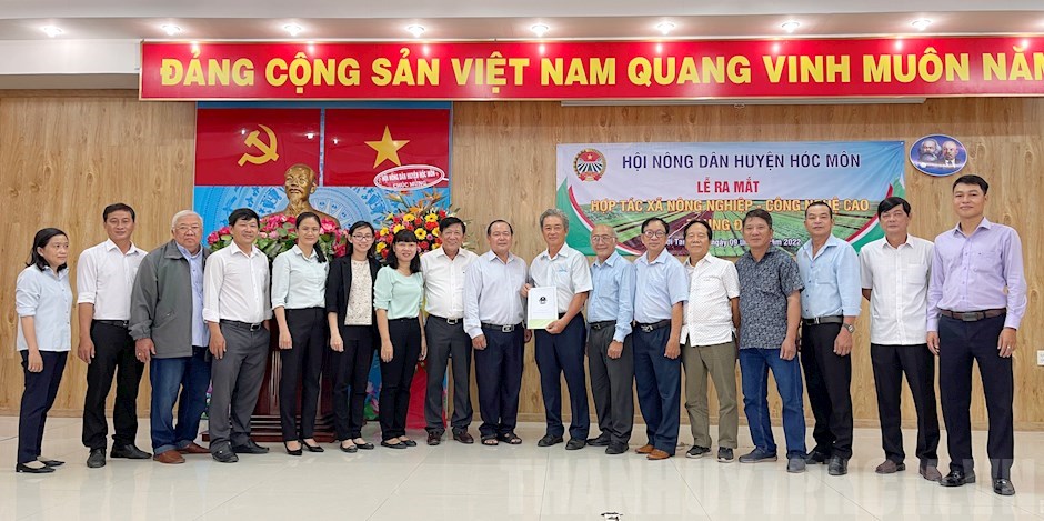Lãnh đạo huyện Hóc Môn trao Quyết định thành lập và chụp hình lưu niệm với thành viên HTX(Thanhuytphcm.vn) - Ngày 9/9, Hội Nông dân huyện Hóc Môn phối hợp Hội Nông dân xã Thới Tam Thôn tổ chức Lễ ra mắt Hợp tác xã (HTX) nông nghiệp công nghệ cao Trung Đông. Đến dự có Phó trưởng Ban Dân vận Huyện ủy huyện Hóc Môn Trần Thúy Hương; Huyện ủy viên, Chủ tịch Hội Nông dân huyện Trương Hùng Cường; Phó Bí thư Thường trực Đảng ủy xã Thới Tam Thôn Nguyễn Thị Ngọc Trân; Phó Bí thư Đảng ủy, Chủ tịch UBND xã Thới Tam Thôn Chu Thị Hồng Nhung.