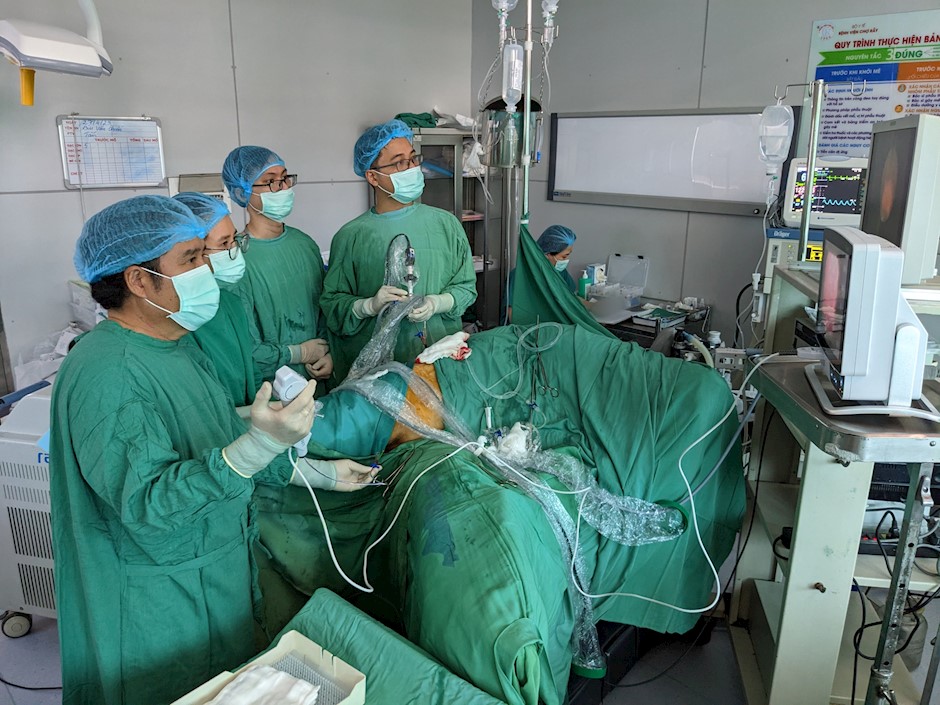 Các bác sĩ phẫu thuật cho bệnh nhân(Thanhuytphcm.vn) - Ngày 11/5, Bệnh viện Chợ Rẫy cho biết, lần đầu tiên bệnh viện kết hợp đồng thời 2 kỹ thuật nội soi trong 1 lần phẫu thuật để điều trị cho bệnh nhân bị sỏi thận tái phát nhiều lần.