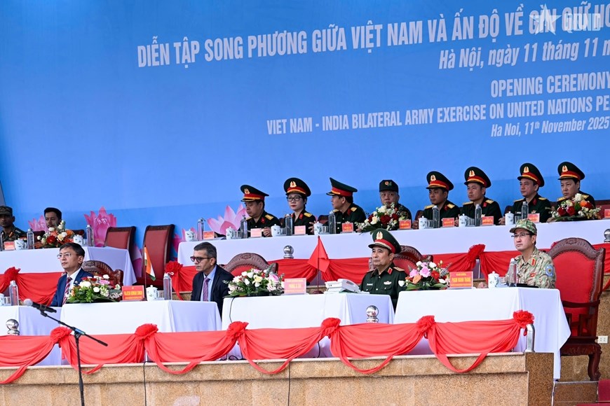 Các đại biểu tại Lễ khai mạc Diễn tập VINBAX 2025.Sáng 11/11, tại Trung tâm Huấn luyện Quân sự quốc gia 4 đã diễn ra Lễ khai mạc Diễn tập song phương giữa Việt Nam và Ấn Độ về gìn giữ hòa bình Liên hợp quốc năm 2025 (VINBAX 2025) do Bộ Quốc phòng Việt Nam phối hợp với Bộ Quốc phòng Ấn Độ tổ chức.