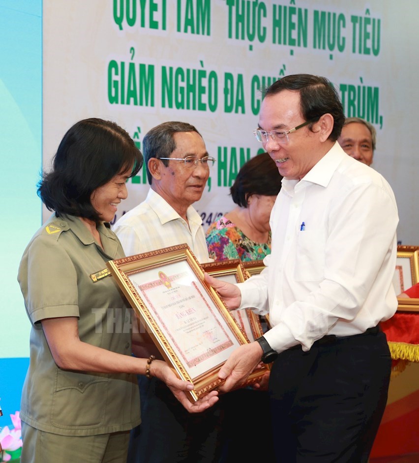 Phó Chủ tịch UBND TP Dương Anh Đức tặng bằng khen cho các tập thể Bên cạnh đó, Bí thư Thành ủy TPHCM Nguyễn Văn Nên đề nghị, cần thường xuyên rà soát, cập nhật thông tin, kế hoạch giảm nghèo bền vững bổ sung các giải pháp hỗ trợ trực tiếp cho người nghèo, hộ cận nghèo, đó là vốn, nghề nghiệp, việc làm, bảo đảm cơ hội tiếp cận các dịch vụ xã hội thiết yếu của TP. Các tổ chức toàn hệ thống phải khơi dậy niềm tin, ý chí vươn lên thoát nghèo bền vững, làm giàu chính đáng. Điều này đòi hỏi sự tận tâm, tận tụy của hệ thống chính trị, của những người có trách nhiệm với xã hội, nhất là ở cơ sở; đồng thời cần cổ vũ động viên tiếp thêm nghị lực cho người nghèo vượt khó, nhân rộng mô hình hay, cách làm tốt, tôn vinh những gương sáng trong đời sống xã hội.