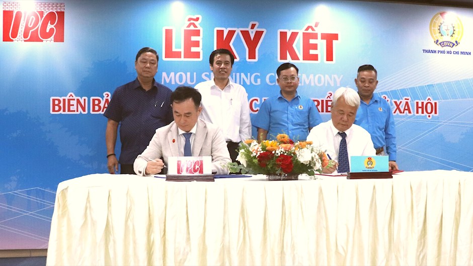Phó Chủ tịch Thường trực LĐLĐ TPHCM Võ Khắc Thái và Quyền Tổng Giám đốc Công ty IPC Võ Hồng Tài ký biên bản ghi nhớ hợp tác. Ảnh: THÁI PHƯƠNG
