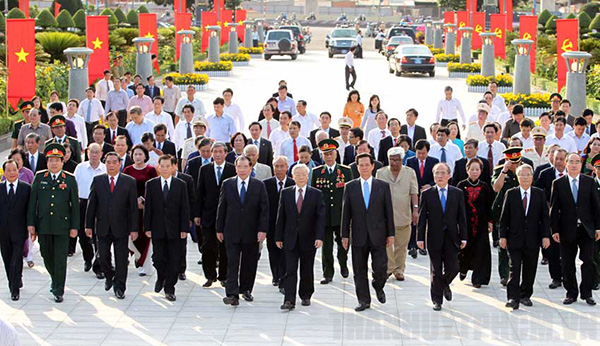 Các đồng chí lãnh đạo Đảng, Nhà nước và nguyên lãnh đạo Đảng, Nhà nước tưởng niệm các Anh hùng liệt sĩ. Ảnh: Thanh Vũ |