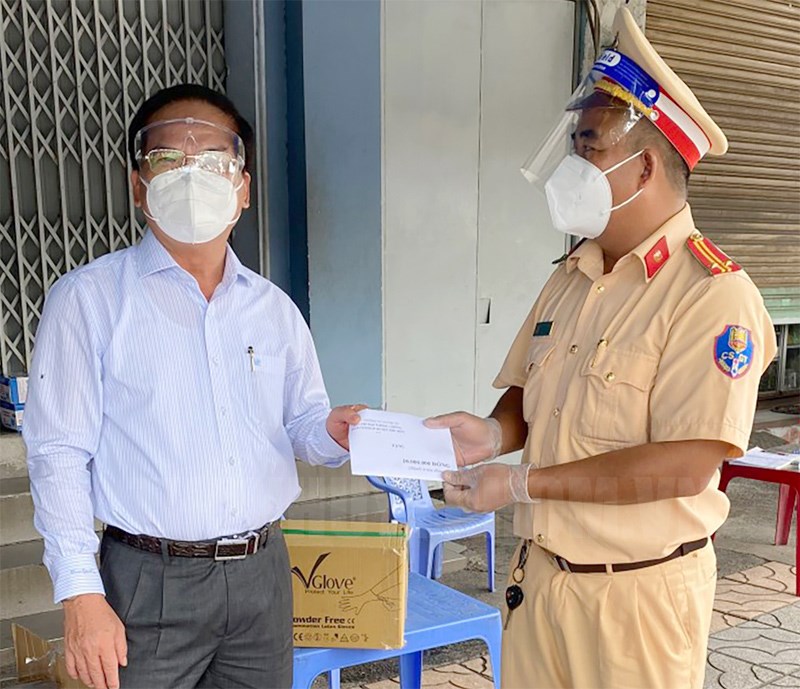 Bí thư Huyện ủy, Chủ tịch HĐND huyện Hóc Môn Trần Văn Khuyên (trái) tặng quà chốt trực tại xã Bà Điểm(Thanhuytphcm.vn) - Sáng 13/8, Huyện ủy huyện Hóc Môn đã tổ chức 3 đoàn công tác đến thăm hỏi, động viên tinh thần lực lượng Công an, Quân sự huyện đang tham gia thực hiện nhiệm vụ tại các chốt trực kiểm soát và Bệnh viện dã chiến thu dung trên địa bàn huyện.