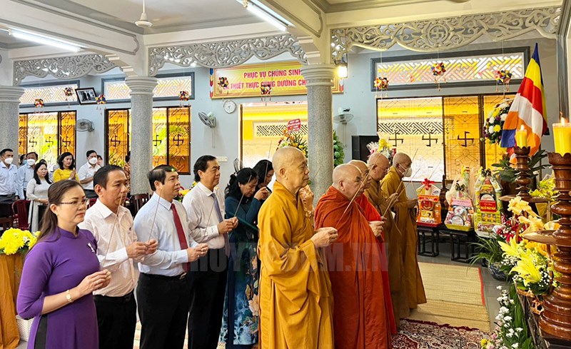 Trong niềm vui của Đại lễ Phật đản Phật lịch 2566 - Dương lịch 2022, thay mặt lãnh đạo quận, Chủ tịch Ủy ban MTTQ Việt Nam quận Thân Trọng Minh đã gửi lời chúc mừng đến các chức sắc, tăng ni, phật tử trong quận đón một mùa Phật đản an vui và ý nghĩa; ghi nhận sự đóng góp tích cực của Ban Trị sự Giáo hội Phật giáo Việt Nam quận và đồng bào phật tử trên các lĩnh vực kinh tế - xã hội, an ninh quốc phòng của quận, đặc biệt là hưởng ứng đóng góp ủng hộ quỹ “Vì người nghèo”, Quỹ “Vì biển đảo quê hương, vì tuyến đầu Tổ quốc”, góp phần đảm bảo an sinh và phát triển kinh tế - xã hội ở địa phương.