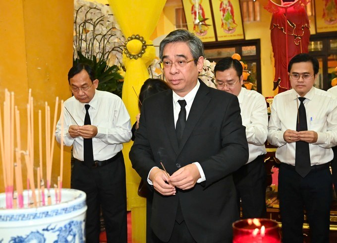 Đồng chí Nguyễn Văn Nên, Ủy viên Bộ Chính trị, Thường trực Tiểu ban Văn kiện Đại hội XIV của Đảng, phụ trách theo dõi, chỉ đạo Đảng bộ TPHCM; đồng chí Trần Lưu Quang, Bí thư Trung ương Đảng, Bí thư Thành ủy TPHCM, gửi vòng hoa viếng.