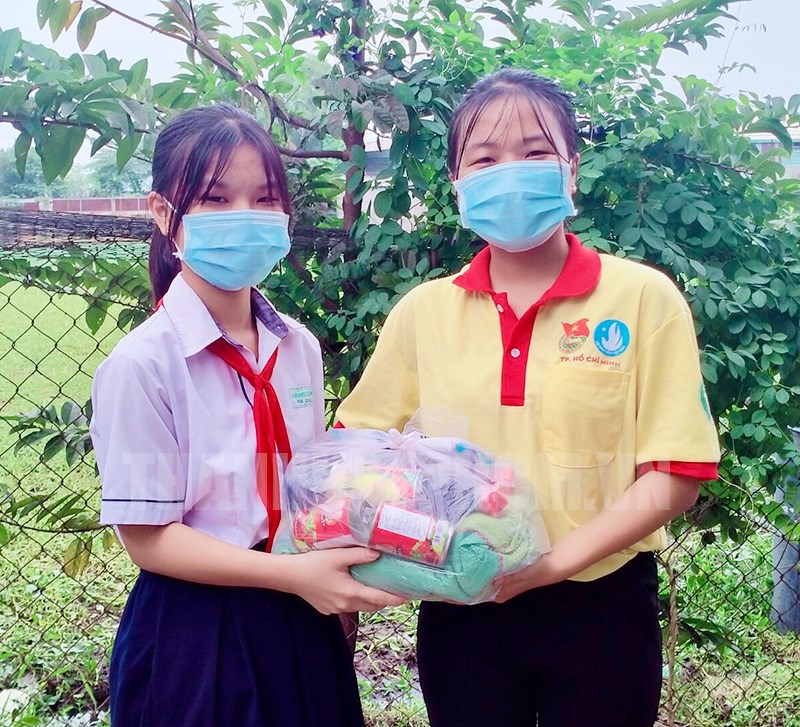Lê Thùy Dương (bìa phải) trao quà cho học sinh khó khăn(Thanhuytphcm.vn) - Thông minh, vui vẻ, hòa đồng và khiêm tốn là cảm nhận đầu tiên của tôi khi tiếp xúc với em Lê Thùy Dương, sinh năm 2004, hiện đang là học sinh lớp 12A2, trường THPT Nguyễn Hữu Tiến. Em là học sinh duy nhất của huyện Hóc Môn vinh dự được tuyên dương “Học sinh 3 tốt” cấp Trung ương năm học 2020 - 2021.