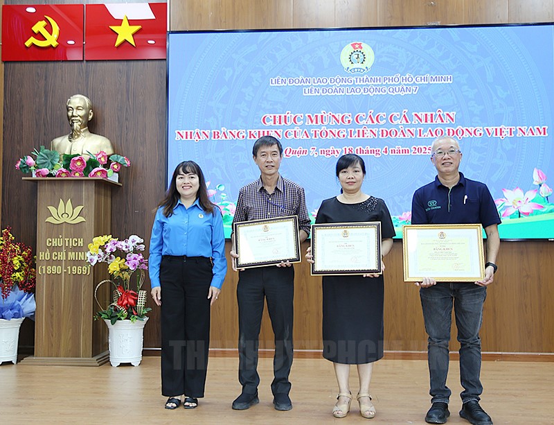 Dịp này, LĐLĐ Quận 7 tuyên dương 1 tập thể vinh dự nhận Cờ thi đua của Tổng LĐLĐ Việt Nam và 4 cá nhân nhận Bằng khen của Tổng LĐLĐ Việt Nam có thành tích xuất sắc trong phong trào thi đua lao động giỏi và xây dựng tổ chức Công đoàn vững mạnh năm 2024; tuyên dương 2 cá nhân vinh dự nhận Bằng khen của Ban chấp hành LĐLĐ TPHCM là nữ công nhân, viên chức tiêu biểu cấp Thành phố giai đoạn 2020-2025.