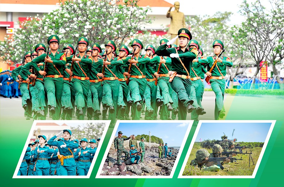 Hàng trên từ trái sang phải: Thiếu tướng Vũ Văn Điền, Tư lệnh Bộ tư lệnh TP Hồ Chí Minh động viên chiến sĩ Trung đoàn Gia Định. * Thiếu tướng Phạm Văn Rậm, phó tư lệnh Bộ tư lệnh TP Hồ Chí Minh chúc mừng, tặng quà đơn vị kết nghĩa quân đội hoàng gia Campuchia nhân dịp tết Chol Thnam Thmay. * Đại tá Nguyễn Thành Trung, Chính ủy Bộ tư lệnh TP Hồ Chí Minh thăm cán bộ, chiến sĩ Ban Chỉ huy Phòng thủ khu vực 6 - Đặc khu Côn Đảo. Ảnh dưới: Quang cảnh lễ ra quân huấn luyện Bộ tư lệnh TP Hồ Chí Minh năm 2025.