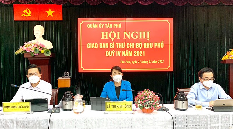 Các đồng chí chủ trì hội nghị.(Thanhuytphcm.vn) - Chiều 21/1, Quận ủy Tân Phú tổ chức hội nghị giao ban định kỳ quý IV năm 2021 với Bí thư chi bộ khu phố và chi bộ chung cư, chuyên đề “Vai trò của Bí thư chi bộ khu phố trong việc thực hiện quy trình công tác kiểm tra, giám sát và thi hành kỷ luật Đảng”. Tham dự và chủ trì hội nghị là Bí thư Quận ủy Lê Thị Kim Hồng; Phó Bí thư Thường trực Quận ủy Phạm Hưng Quốc Bảo; Phó Bí thư Chủ tịch UBND quận Phạm Minh Mẫn...