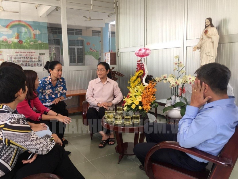 Cô Trần Thị Tuyết Vân (thứ 3 từ trái sang) và đoàn lãnh đạo phường 10 thăm cơ sở tôn giáo(Thanhuytphcm.vn) - Phải đặt lợi ích tập thể lên trên lợi ích cá nhân, việc gì làm có lợi cho người dân thì phải làm và quyết tâm làm bằng được… Đó là tiêu chí làm việc của cô Trần Thị Tuyết Vân, nguyên Bí thư Đảng uỷ Phường 10, Quận 3. Sau khi nghỉ hưu, cô tham gia công tác tại địa phương, phụ trách công tác dân vận và tuyên giáo Đảng ủy, là điển hình Dân vận khéo năm 2018 cấp quận và đề xuất cấp thành phố.