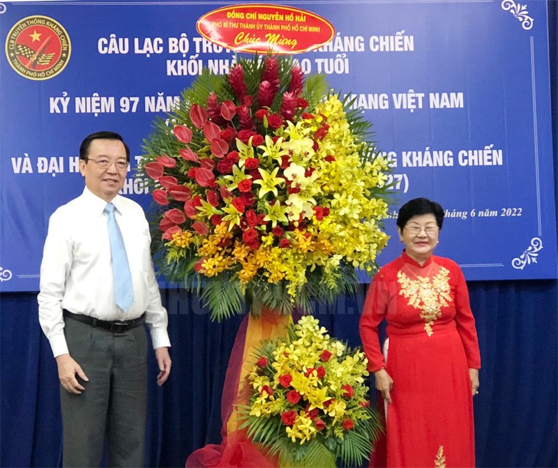Phó Trưởng ban Thường trực Ban Tuyên giáo Thành ủy Lê Hồng Sơn tặng hoa chúc mừng Đại hội.(Thanhuytphcm.vn) - Sáng 16/6, Câu lạc bộ kháng chiến khối Nhà báo cao tuổi (CLBKNBCT) tổ chức kỷ niệm 97 năm ngày Báo chí Cách mạng Việt Nam (21/6/1925-21/6/2022) và Đại hội lần thứ V CLBKNBCT (2022 – 2027). Đến dự có Thành ủy viên, Phó Trưởng ban Thường trực Ban Tuyên giáo Thành ủy TPHCM Lê Hồng Sơn.