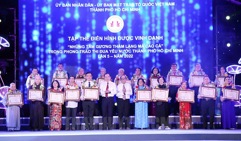 Bí thư Thành ủy TPHCM Nguyễn Văn Nên và nguyên Phó Chủ tịch Ủy ban Trung ương MTTQ Việt Nam Trần Hoàng Thám trao khen thưởng cho các tập thể, cá nhân. (Ảnh: Đan Như)(Thanhuytphcm.vn) – Phát biểu tại Lễ tuyên dương “Những tấm gương thầm lặng mà cao cả” trong phong trào thi đua yêu nước TPHCM lần 5 – năm 2022 do UBND TP, Ủy ban MTTQ Việt Nam TPHCM tổ chức tối 9/11, Ủy viên Bộ Chính trị, Bí thư Thành ủy TPHCM Nguyễn Văn Nên nhấn mạnh: “Những gương thầm lặng mà cao cả ngày nay góp phần bồi đắp thêm tâm hồn, tình cảm, nhân cách của chúng ta. Tất cả đều có một điểm chung, đó là tình yêu nước, yêu thương con người, để thầm lặng cống hiến vì mọi người, vì cộng đồng, vì TP thân yêu của chúng ta”.