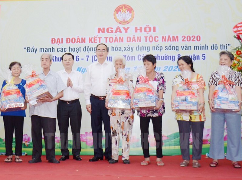 Trưởng đoàn Đại biểu Quốc hội TPHCM Nguyễn Thiện Nhân và Bí thư Quận ủy Quận 5 Nguyễn Văn Hiếu trao tặng phần quà cho các hộ gia đình có hoàn cảnh khó khăn.(Thanhuytphcm.vn) - Chiều 20/11, tại trường Mầm non Sơn Ca, Ban Công tác Mặt trận Khu phố 6, 7 - Chung cư Xóm Cải (Khu phố 7, Quận 5) tổ chức Ngày hội Đại đoàn kết toàn dân tộc năm 2020 với chủ đề “Đẩy mạnh các hoạt động văn hóa và xây dựng nếp sống văn minh đô thị”. Đến dự có các đồng chí: Nguyễn Thiện Nhân, Ủy viên Bộ Chính trị, theo dõi và chỉ đạo Đảng bộ TPHCM, Trưởng đoàn Đại biểu Quốc hội TPHCM; Nguyễn Văn Hiếu, Ủy viên dự khuyết Trung ương Đảng, Ủy viên Ban Thường vụ Thành ủy, Bí thư Quận ủy Quận 5; Dương Anh Đức, Thành ủy viên, Phó Chủ tịch UBND TP; Trần Hữu Phước, Phó Chủ tịch Ủy ban MTTQ Việt Nam TPHCM.